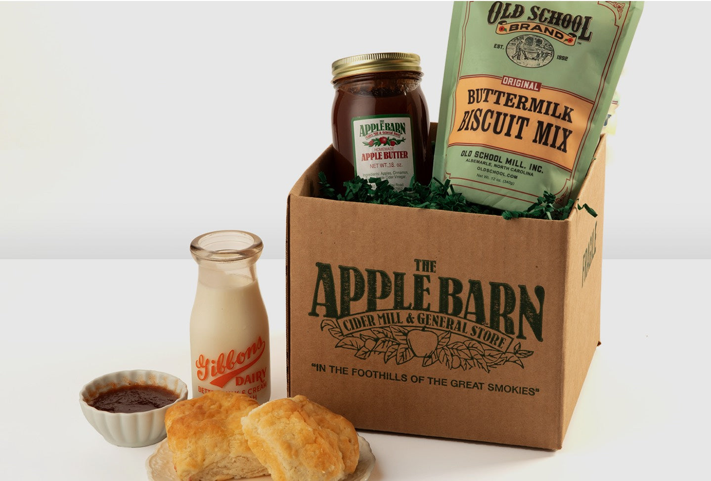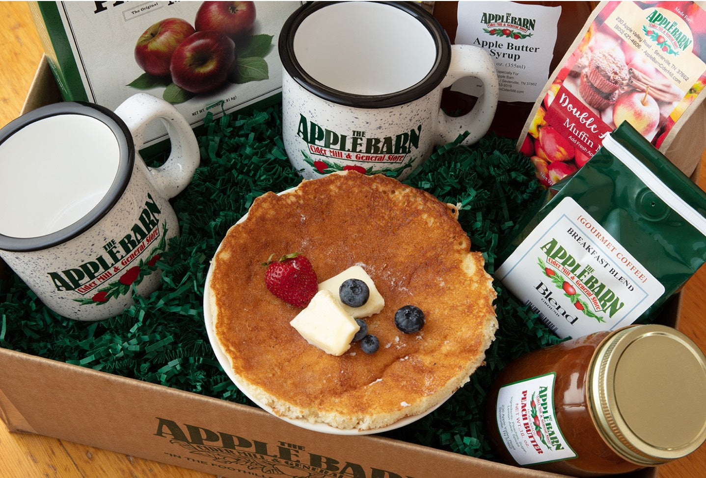 Our Breakfast Bundle is a perfect gift—or a tasty reminder of your visit to the Apple Barn. It has everything you need to make a memorable breakfast, with Benton's Bacon, Apple Butter Syrup, Pancake Mix, Muffin Mix, gourmet coffee, and 2 coffee mugs.